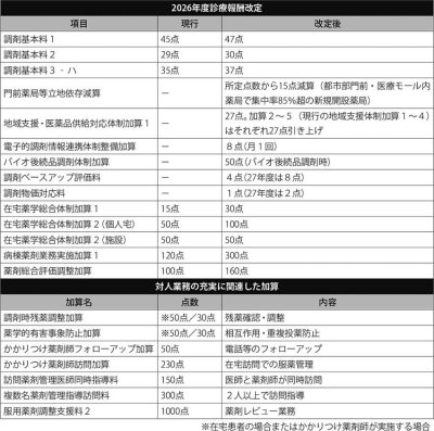 薬局薬剤師の賃上げに対応した調剤ベースアップ評価料は26年度が4点、27年度は8点で、1人薬剤師の薬局は算定できない。物価上昇に対応した「調剤物価対応料」は26年度が1点、27年度は2点とした。